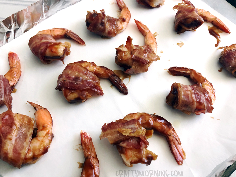 - Place the pans of bacon wrapped shrimp under the broiler and cook on 425 degrees for 15 minutes until shrimp is cooked and bacon is crisp.