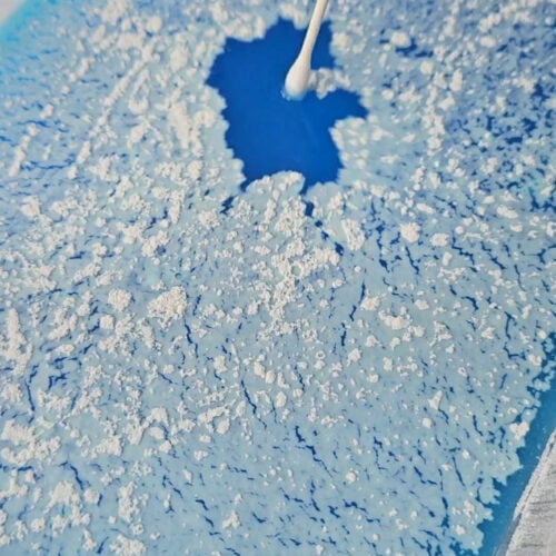 - Dip the q-tip into the soap then press into the baby powder. It will "crack" one or two times.