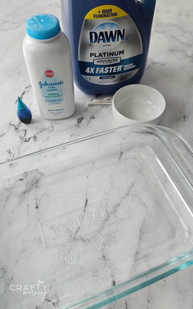- Fill dish with water leaving some room on top, then add a couple drops of blue food coloring. Stir.
