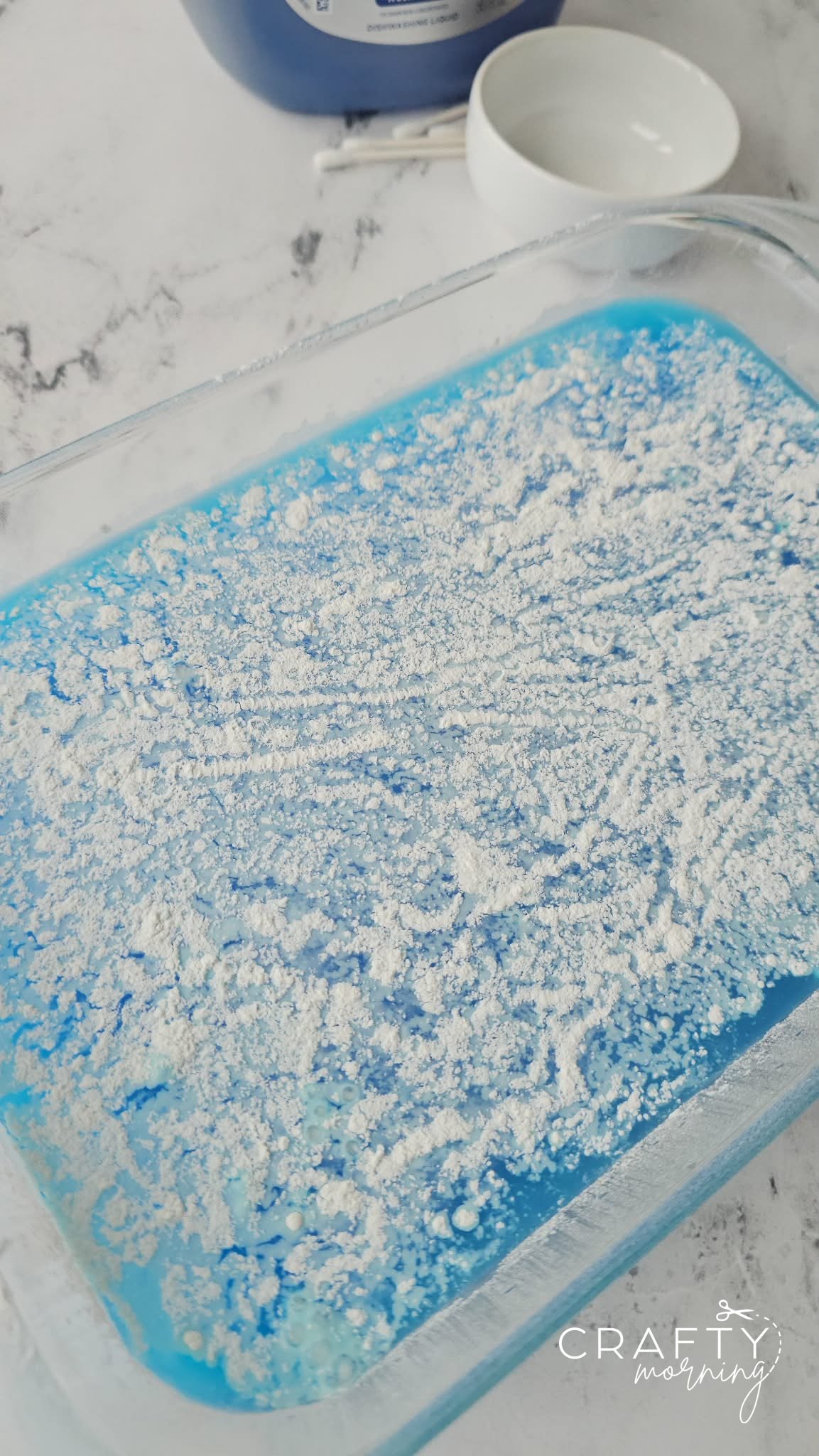 - Fill dish with water leaving some room on top, then add a couple drops of blue food coloring. Stir.