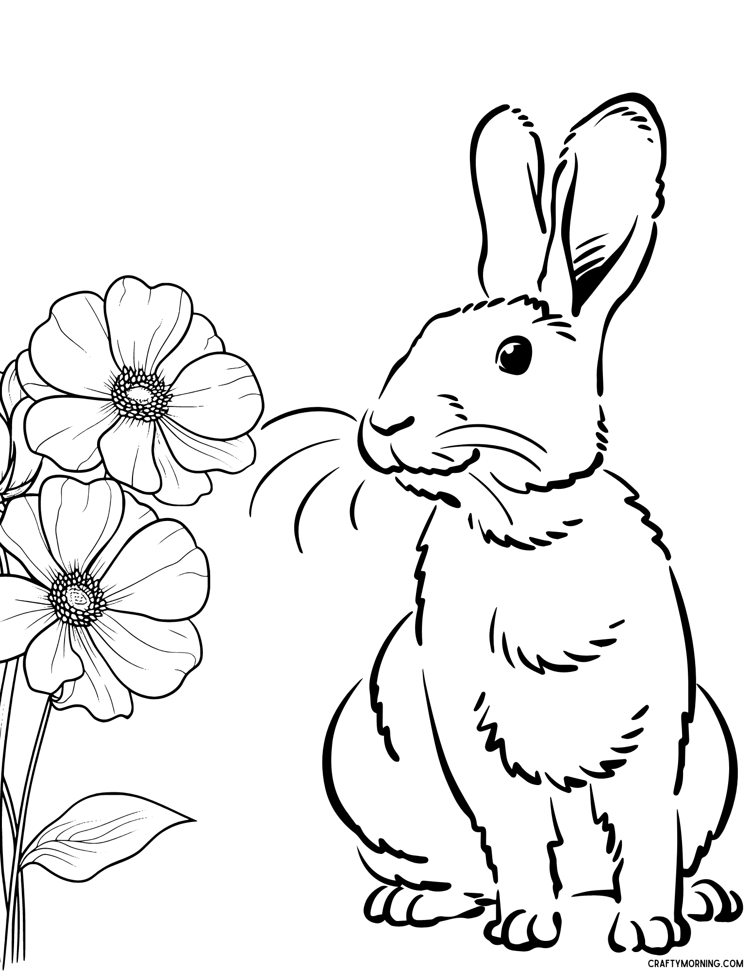 A pretty bunny coloring page that has a rabbit smelling some flowers.