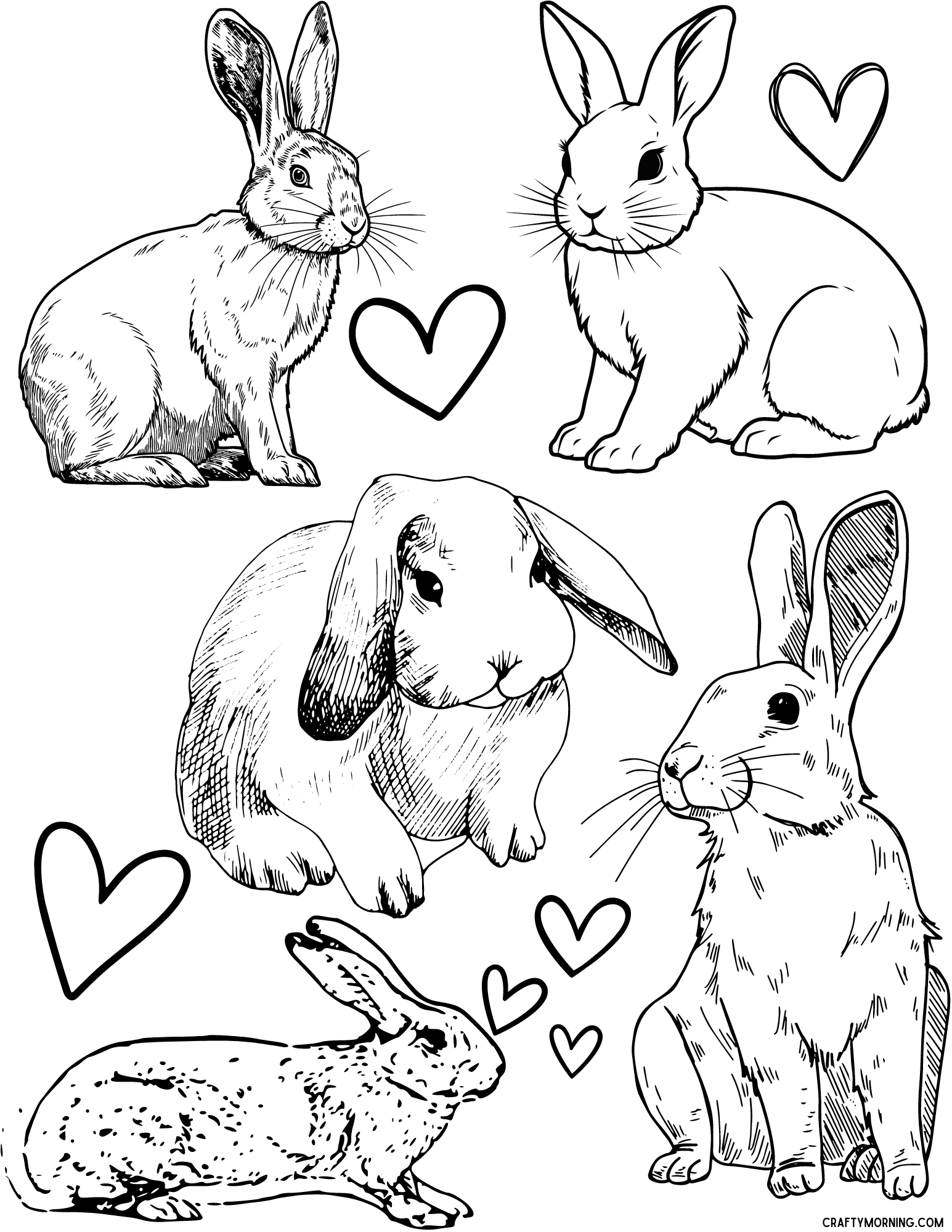 I love bunnies coloring page! Five adorable different breeds of rabbits with hearts to color.