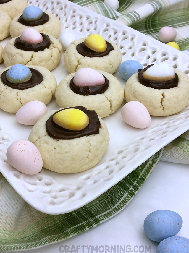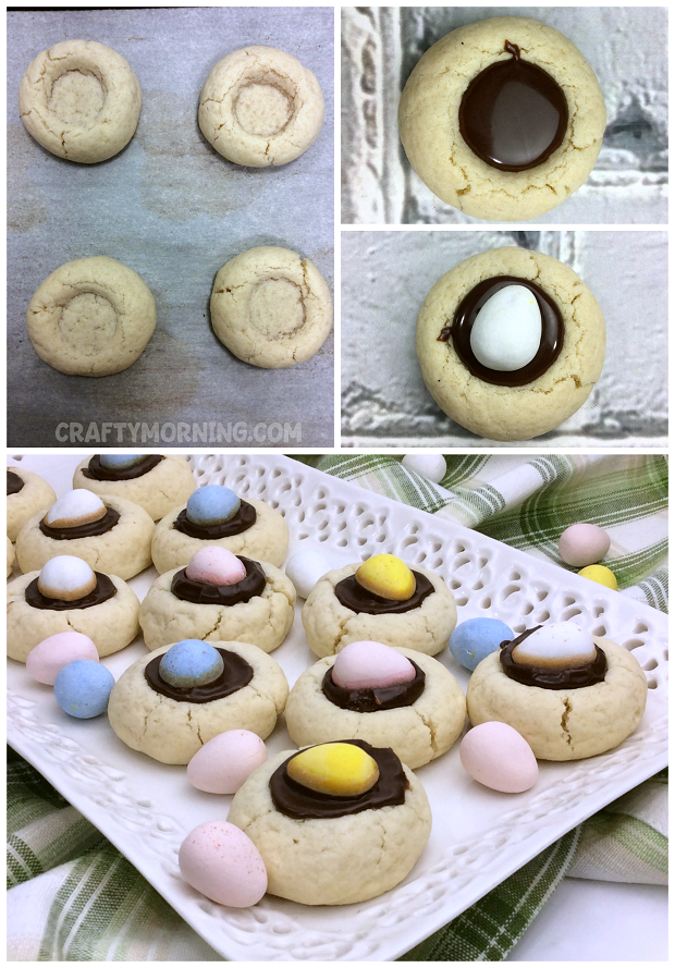 - Spoon the chocolate frosting into each thumbprint and top with a mini Cadbury egg.