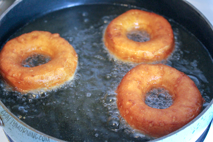 - When the oil is ready, drop the doughnut into the oil. When it is golden brown, flip it over. It will not take long – generally only a minute to a minute and a half.