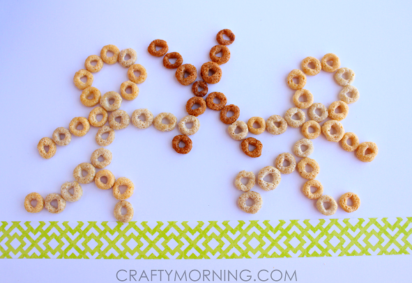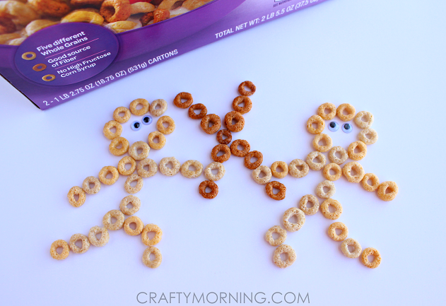 Start with 8 cheerios for the head and work your way down. Use the darker brown cheerios for the swords! If you want to keep this as an art project have them glue the cereal to a piece of paper.