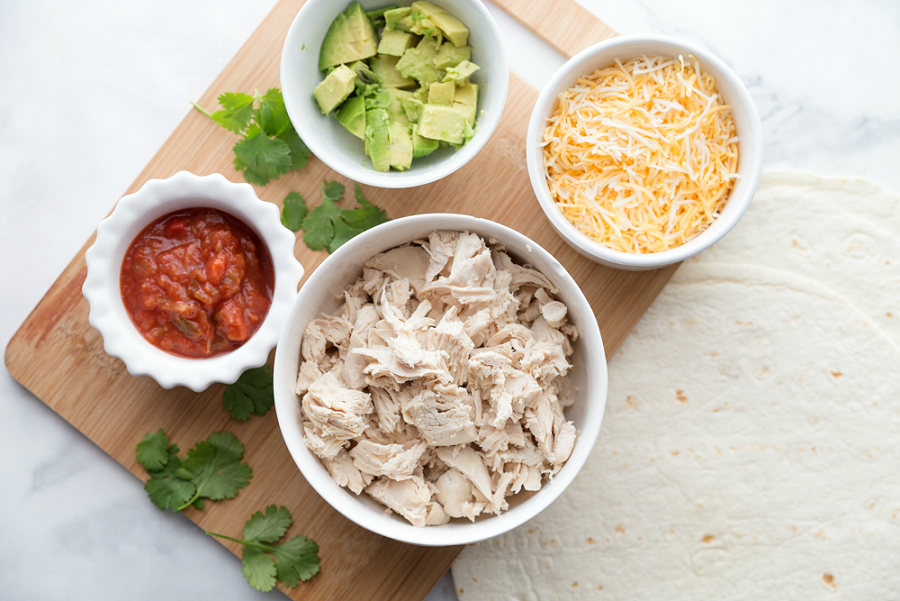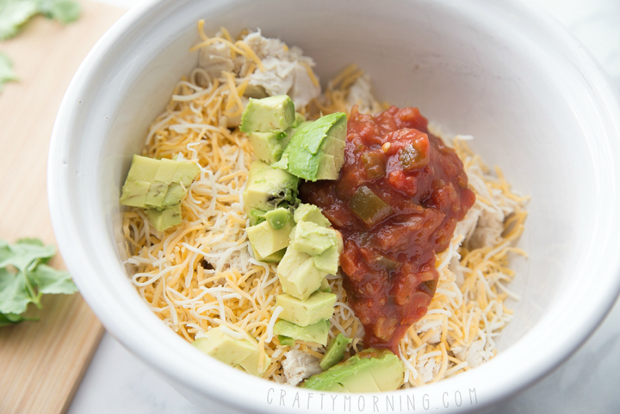 - Mix chicken, avocado, cheese, salsa, cilantro, and sour cream in a bowl.