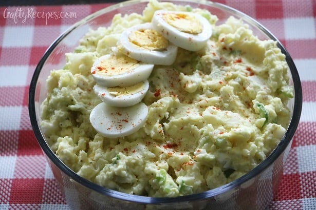 - In a large mixing bowl, combine the celery, green onions, eggs, mayo, mustard and vinegar. Once combined toss in the potatoes to the mixture, taste and season accordingly with salt and pepper. Add paprika on top for garnish.