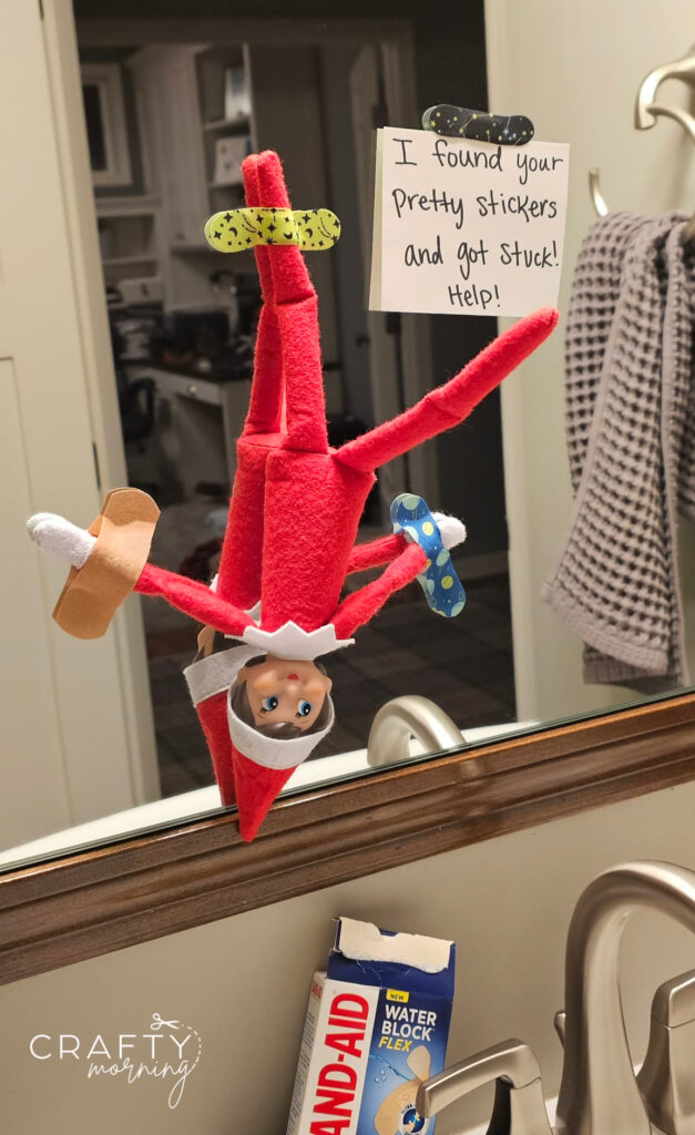 Elf gets stuck on the mirror using band-aids!