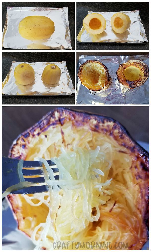 - Bake for 45 minutes until the sides of the spaghetti squash are tender.
