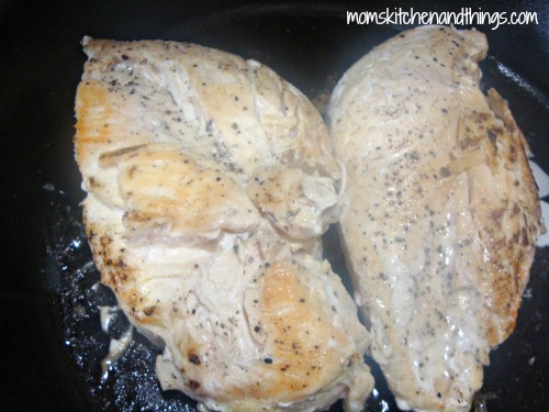 - Thoroughly cook chicken in a frying pan. Â Slice into strips.