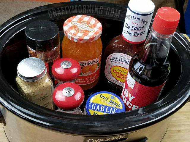 - Dump the marmalade, bbq sauce, garlic, red pepper flakes, soy sauce and cover the crockpot.