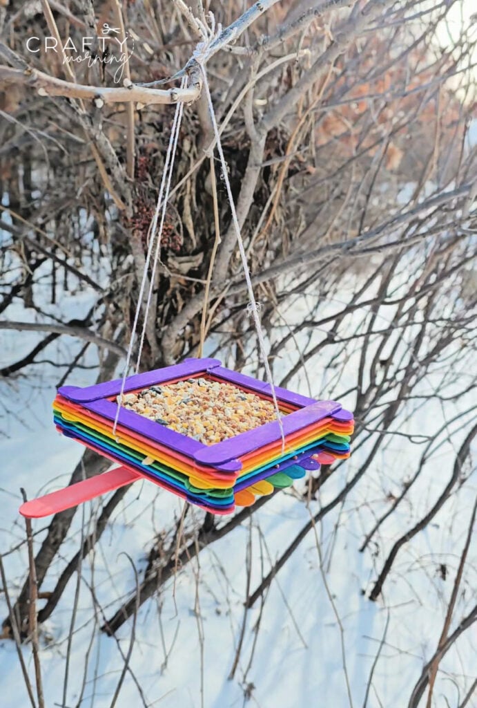 This one is such a classic and honestly one of my favorites because it feels like real crafting. You just glue the sticks together into a little tray or house shape, and kids love seeing it come together piece by piece. It’s great for working on patience (and glue control), and once it’s dry, filling it with birdseed feels extra exciting. Hang it up and suddenly you’ve got a front-row seat to backyard bird watching.