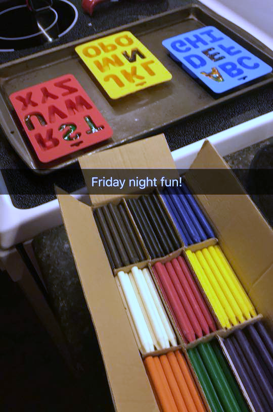 “I used crayons crayons, had to peel first but used an exacto knife to slice the side open first. Chopped crayons into about 1/4inch sections. Put in molds. 220° for 10 min then I pulled them out and added a little more crayon because they melt down, I always added more before completely melted so the colors didn’t mix altogether to much. Then back in oven about another 10 min once completely melted I put out on the deck to harden for 10 to 15 min. Once you bring inside let it warm up a bit. They will break if you try and take them out right away. It was a very fun project. I ended up redoing all of mine because I crushed crayons first with hammer and all the colors ran together and they all looked dark brown or black. So a little bigger chunks I think is better.” -Theresa McGinn