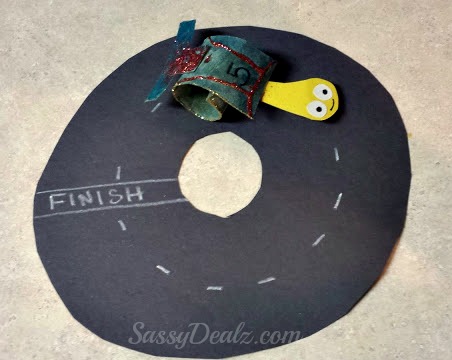 The last step is to make a racetrack out of black construction paper and a white crayon. Taa-daa! My little 3 year old friend sent Turbo round n’ round n’ round the track :) Have fun!