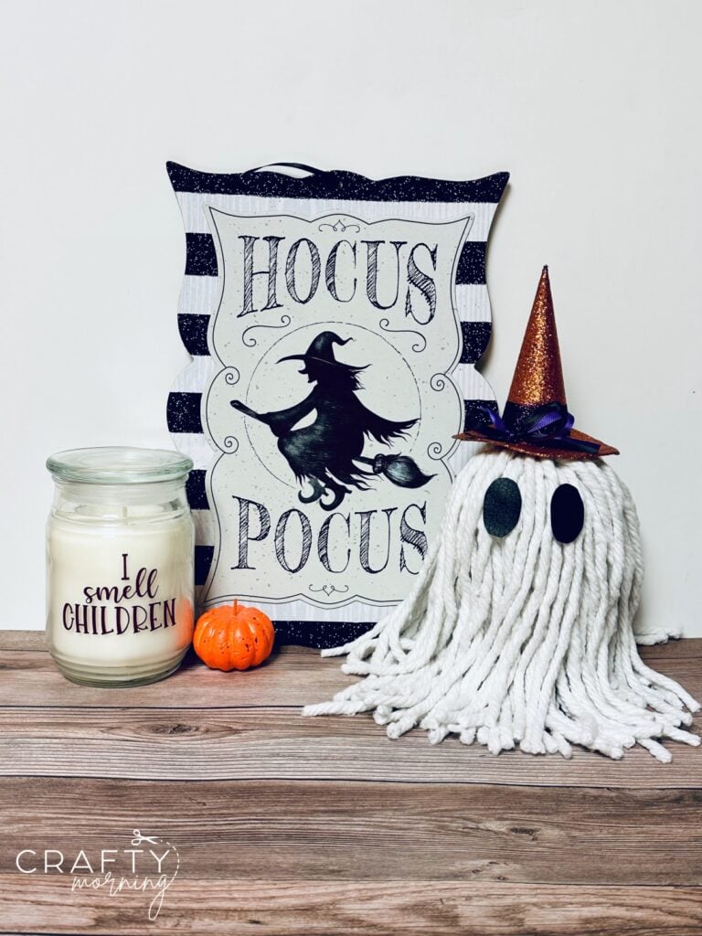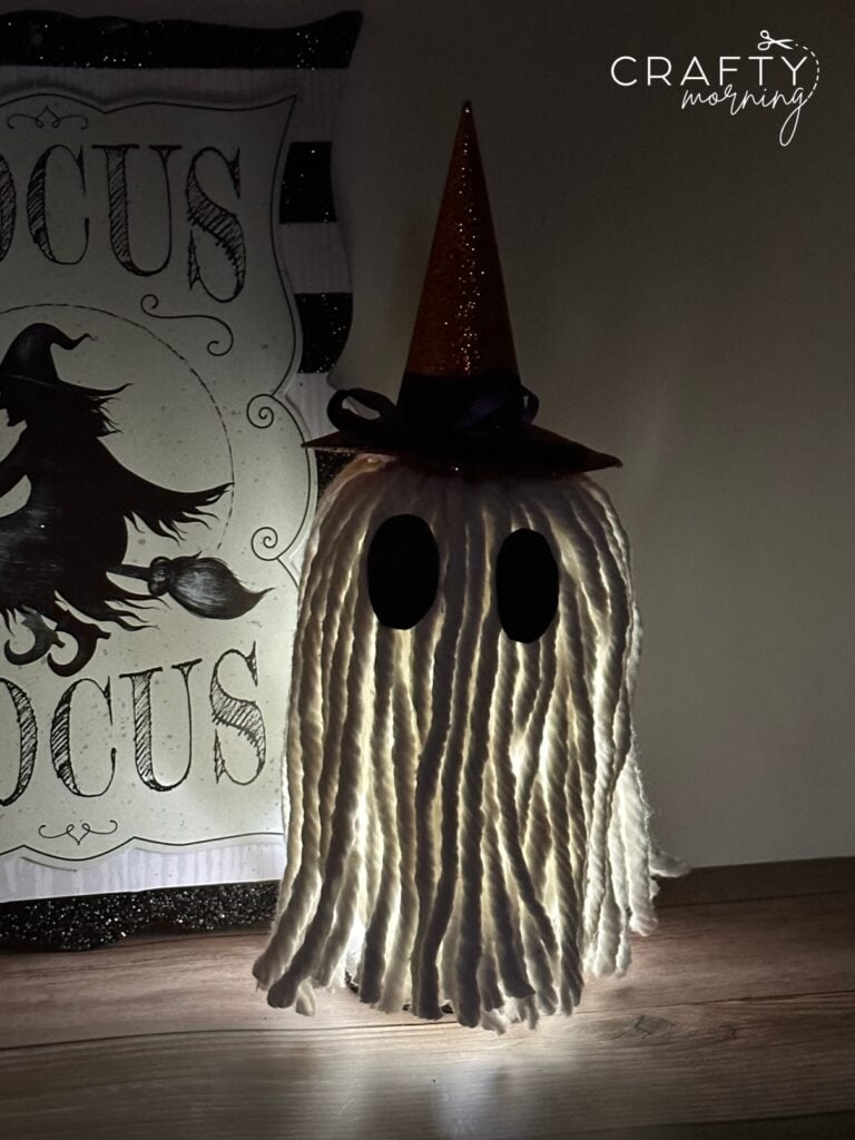 Make a cute little mop ghost for a Halloween decoration! It’s cheap and easy to make! He looks so cute sitting on the kitchen counter glowing at night.