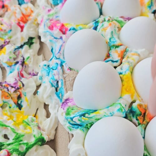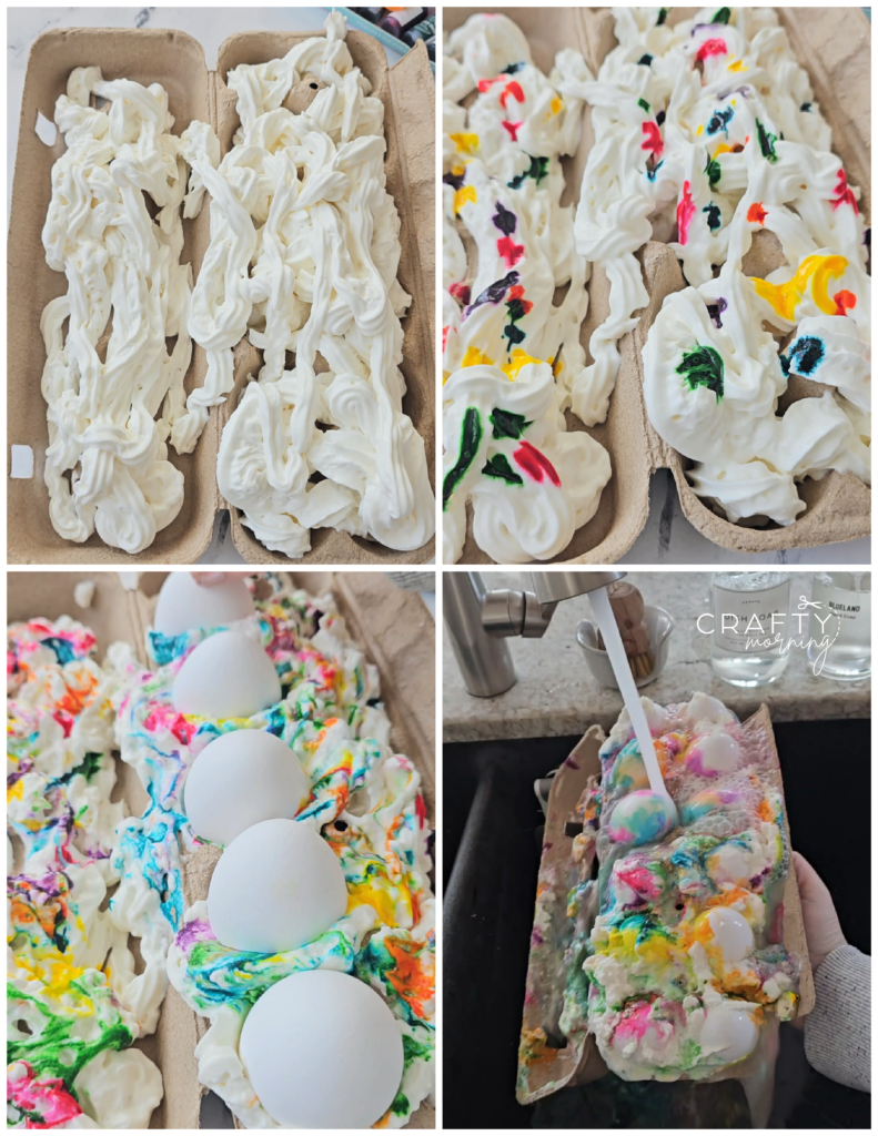 Make life easier this year by dyeing your Easter eggs INSIDE an egg carton. You only need a few ingredients. I used these vibrant food dyes that have 36 colors! You can also use shaving cream or cool whip too.