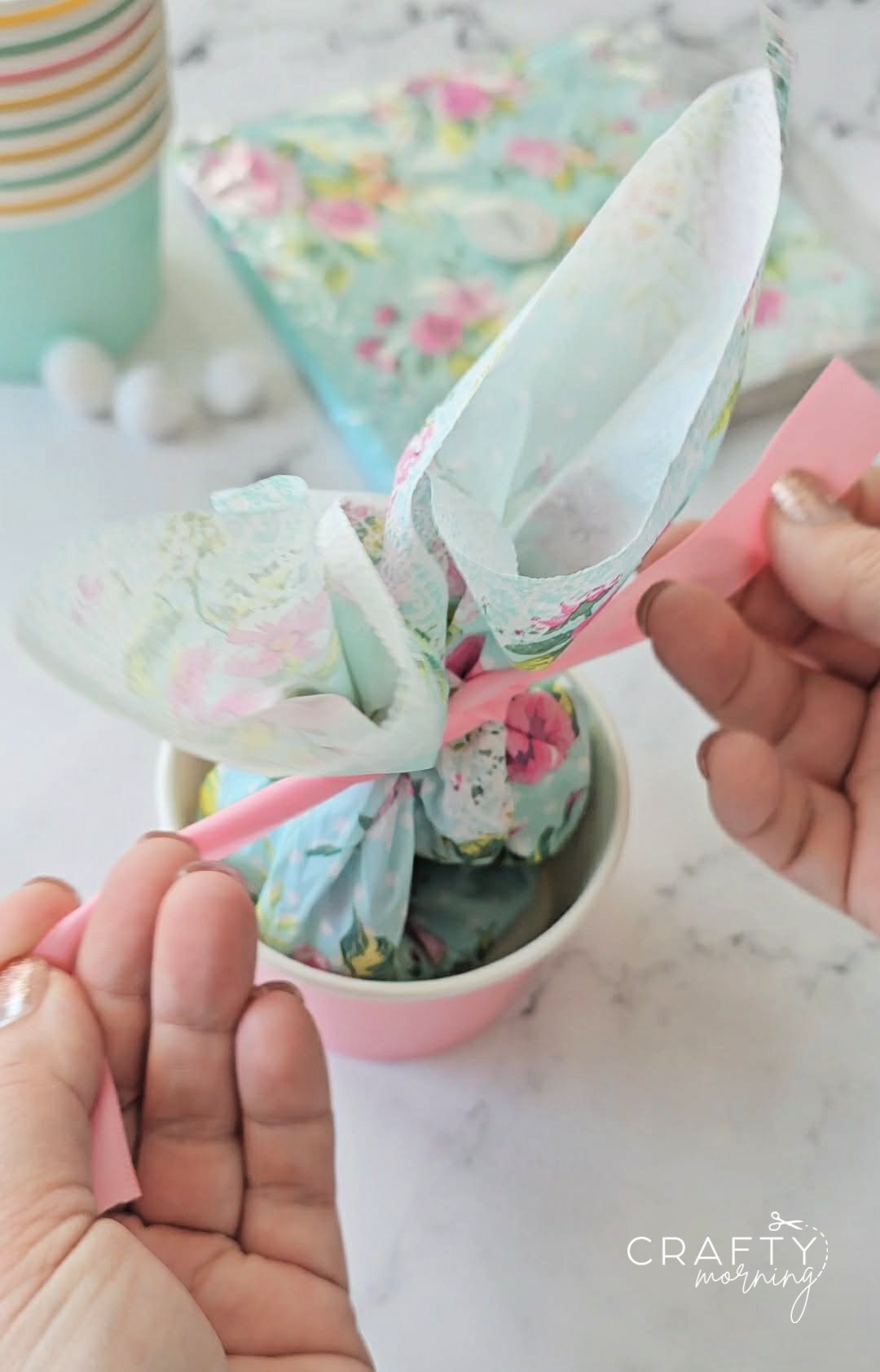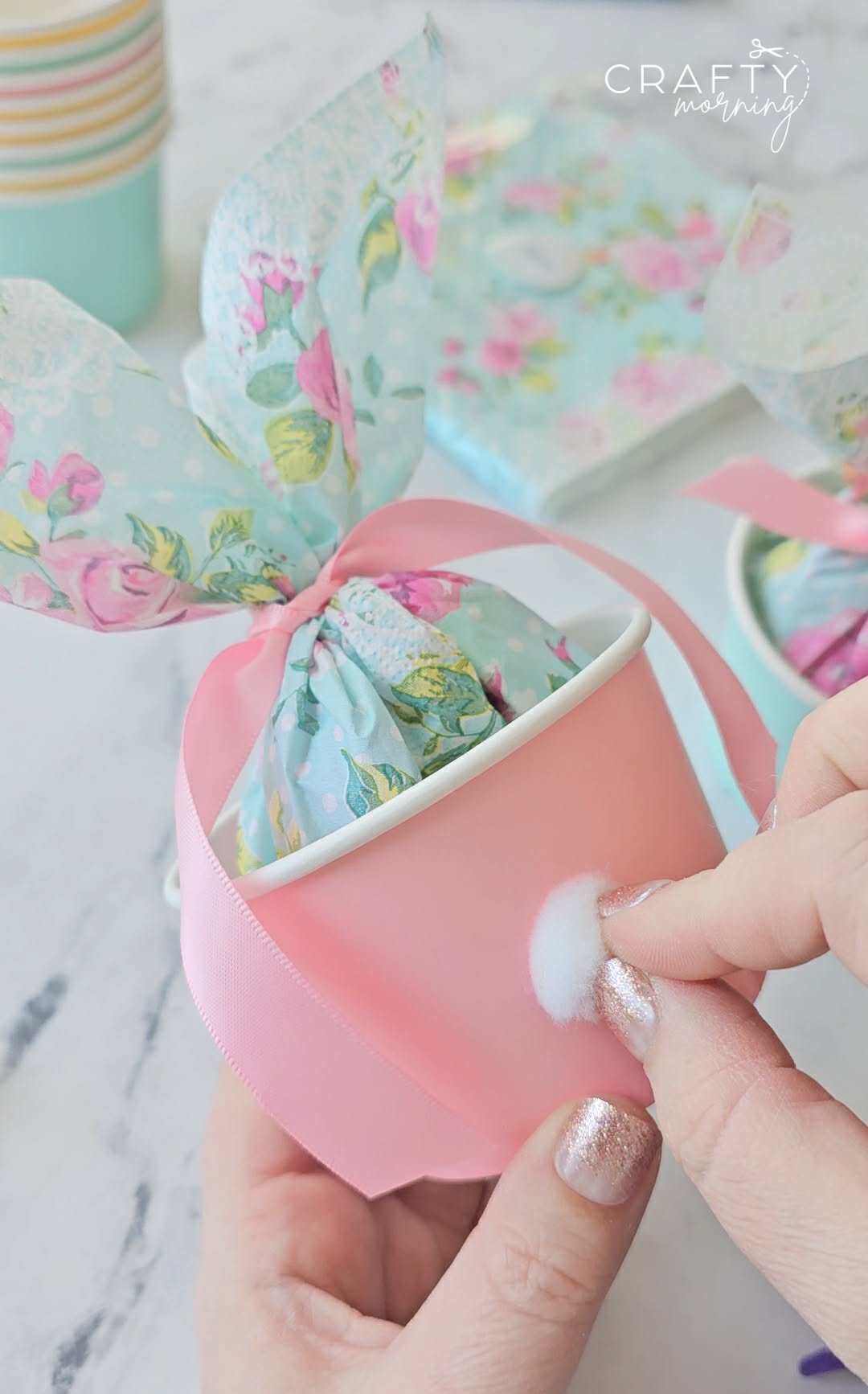 Make some cute Easter treat cups for gifts this year! I got the pastel treat cups at Target but Walmart also has them online. I got the pretty flower napkins on Amazon but I think they sold out but these ones are similar.