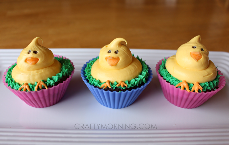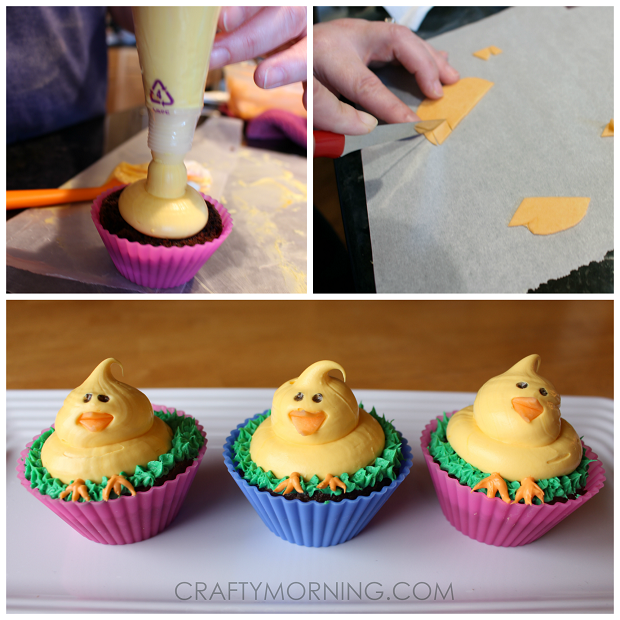 After 5 or 10 minutes, take them out and pipe green grass around the chicks. Add some black eyes either with an edible marker or sprinkles. To make the beak, we heated up an orange starburst candy for a few seconds and rolled it flat with a rolling pin. Cut a diamond shape out with a knife and bend it in half. Stick it on the chicks face to make it 3D! Finish the chick by piping on some orange little feet.