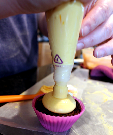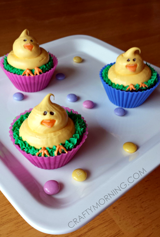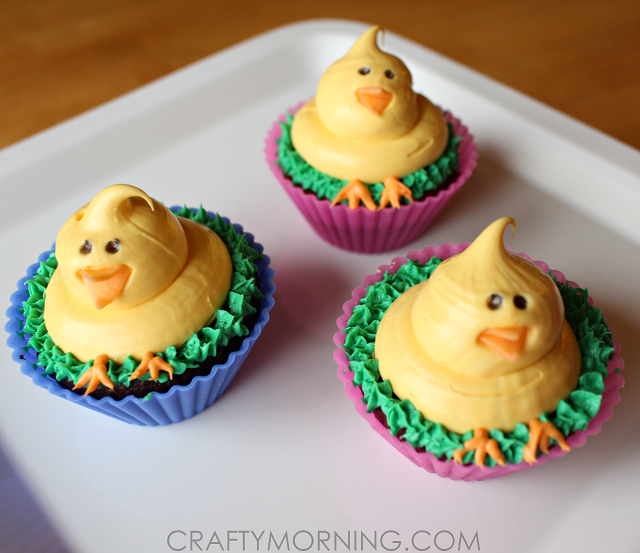 Put yellow frosting into a piping bag with a big circle attachment. Using the pressure of the bag, push the frosting out of the bag making a round circle then lift up in the middle to make the chick’s head. Put in the fridge to harden a bit.