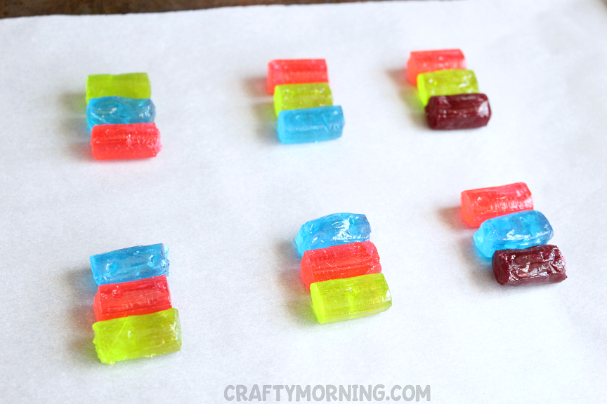- Place parchment paper or a silicone baking mat on a baking sheet. Arrange 3 Jolly Rancher candies close together. You can make them all the same color or arrange in any pattern you’d like. Make sure to leave room for the lollipop sticks you’ll be adding.