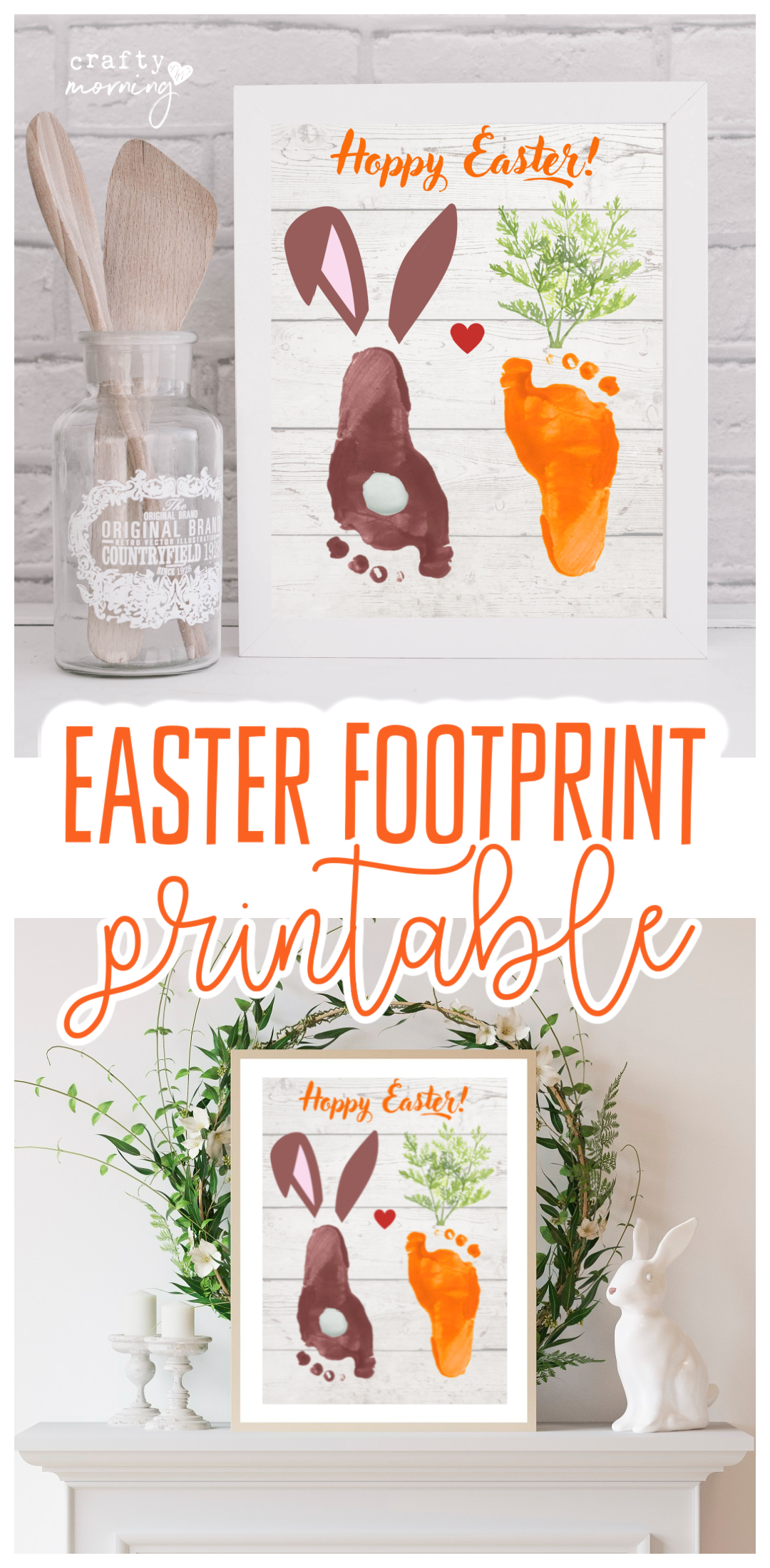 Make the cutest Easter keepsake with your kid’s footprints this year! Just download the Easter footprint printable then paint your child’s foot with orange paint, then stamp it under the carrot’s green top. Let dry then paint your child’s other foot with brown paint and stamp it under the bunny ears. Once they are totally dry, glue on a cottonball or white pom pom for the tail. Put in a frame and enjoy!