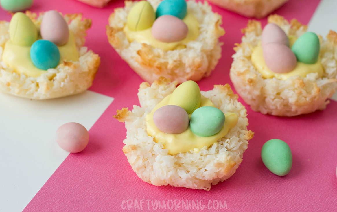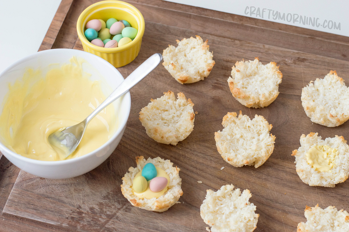 - Pour melted candy into the center of each macaroon. Top each one with 3 candy eggs and allow to set. Serve and enjoy!