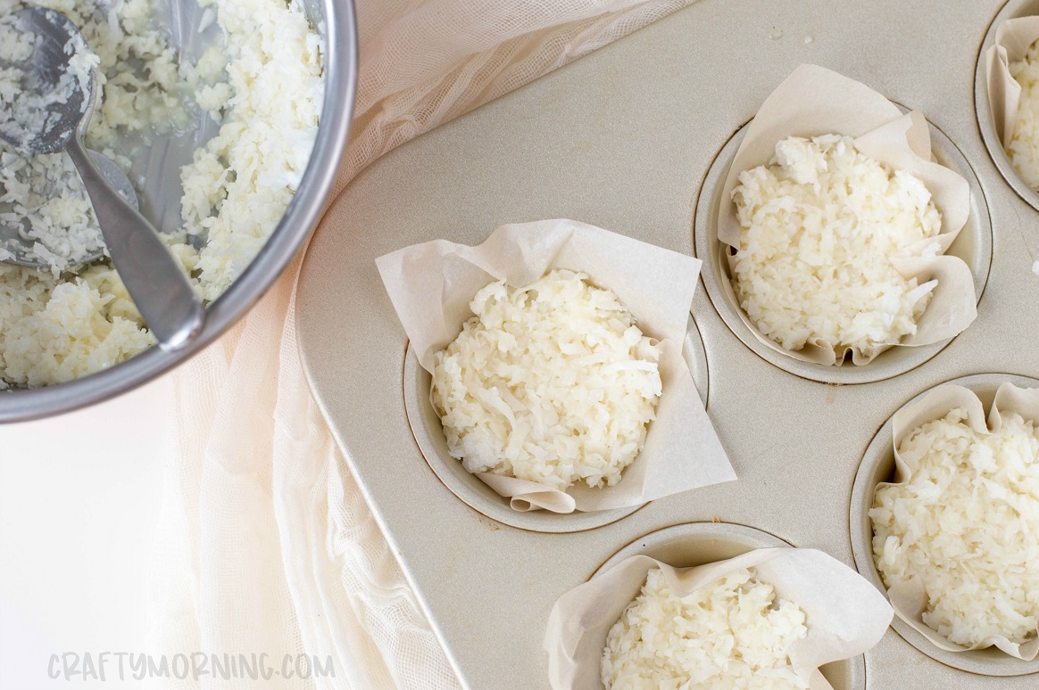 - Using two spoons, scoop coconut mixture into each lined muffin section, filling it up about 2/3 of the way. Use the back of your spoon to create an indent in the center of each unbaked macaroon.