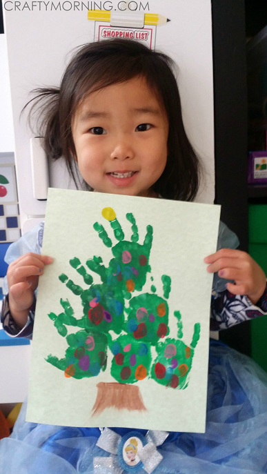 Have the kids paint their hand with green paint and stamp it in a pyramid shape (starting with 3 on the bottom, 2 in middle, and 1 on top). Once that dries, have them choose random colors and put fingerprints all over the tree to resemble ornaments.