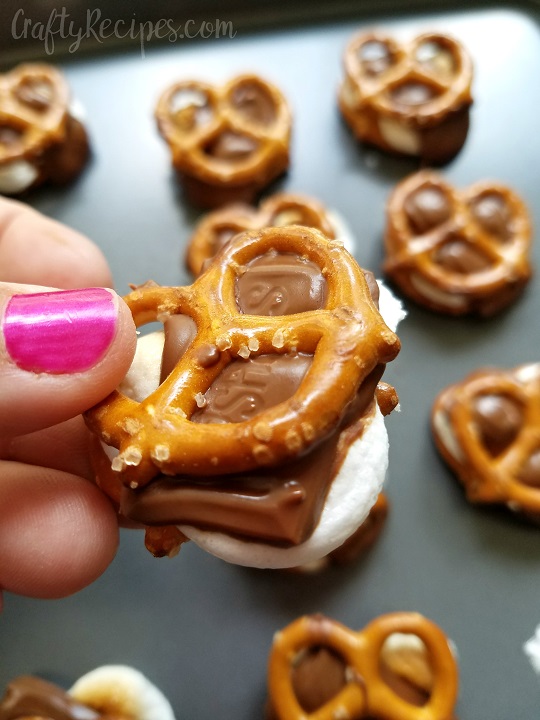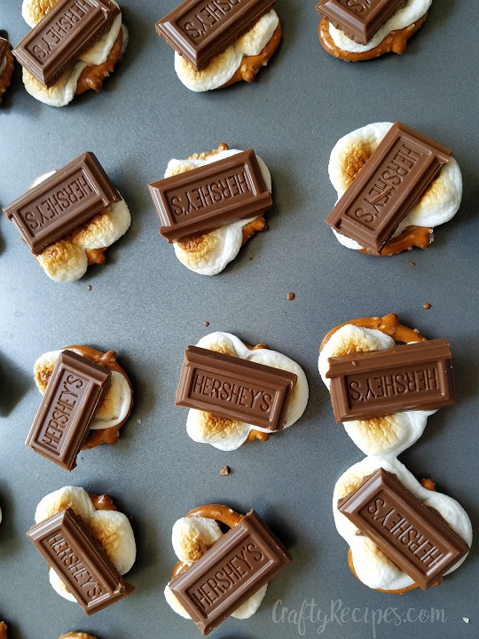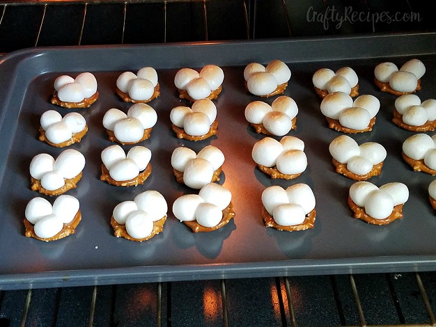 - Place three marshmallows on each pretzel and stick in the oven for 2-3 minutes.