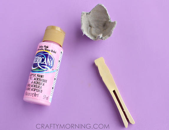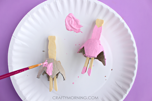 Start by cutting individual cups of the egg carton. Using a knife is a little easier to get the triangle cut-outs. Poke a hole on the top of it and stick a peg in it. Paint the egg carton and ballerina shoes on the peg.