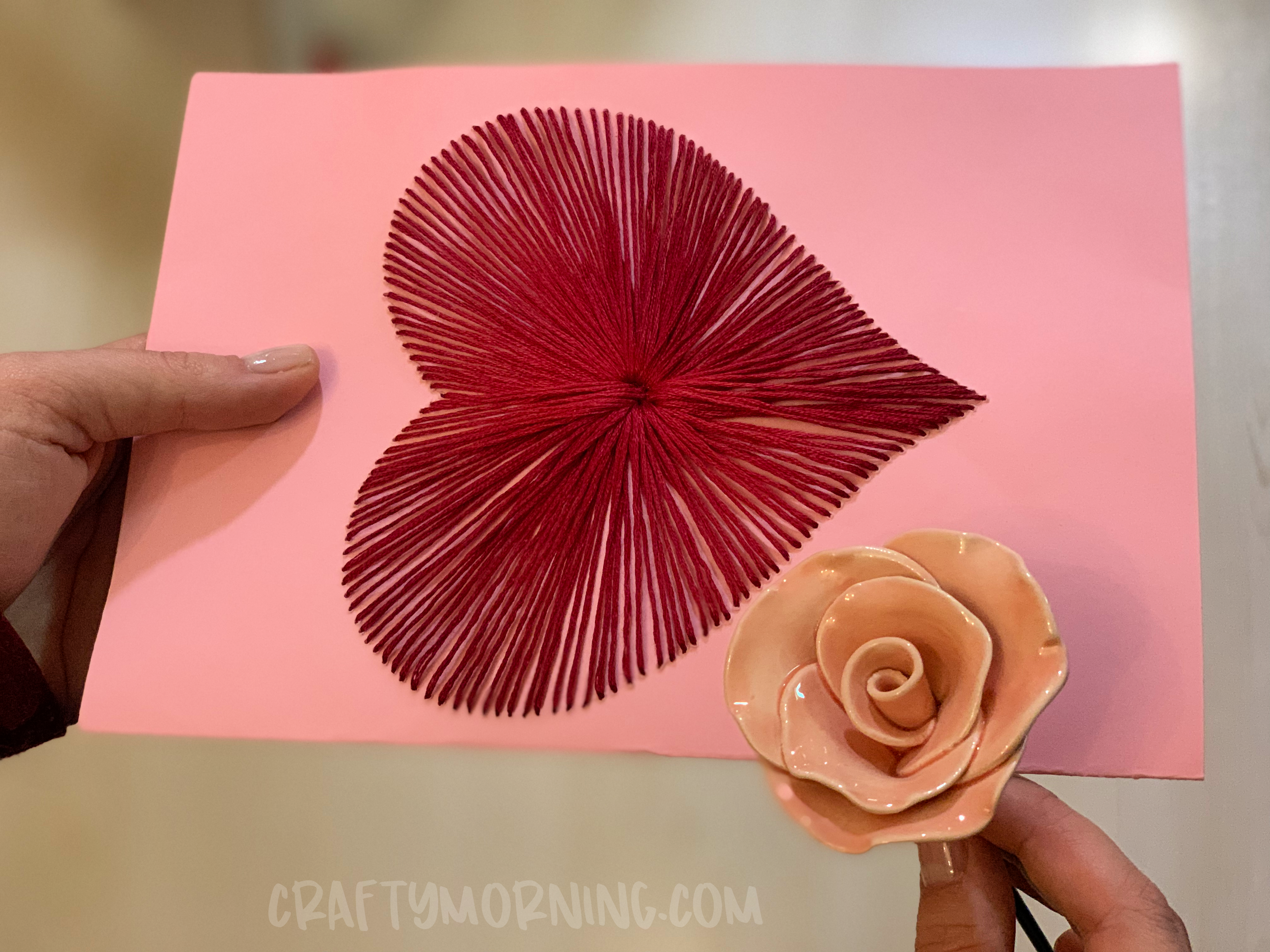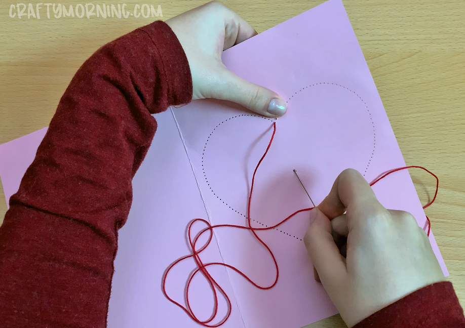- Continue going around the heart back and forth until you get back to the start. Poke the needle to the inside of the card and continue threading back and forth. Tie the beginning string with the last on the inside and cut the excess. Write in the card and you're done!