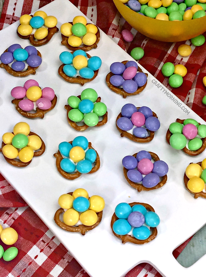 - Using 5 M&M’s from a color, form a flower on the chocolate
