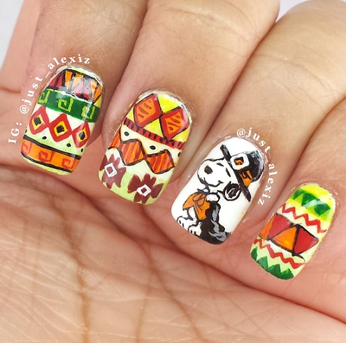 Wow! Snoopy thanksgiving nails with tribal patterns! by just_alexiz