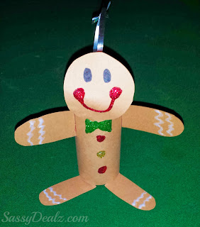 Perfect for a Christmas kids craft, here is a cheap one to make! We made a gingerbread man out of an empty recycled toilet paper roll! I’m obsessed with glitter so that’s why we used so much but you can always use just regular construction paper. We made our gingerbread into a Christmas ornament just by poking a hole and tying a string in the back. It could be a very cute and frugal gift for someone! ;)