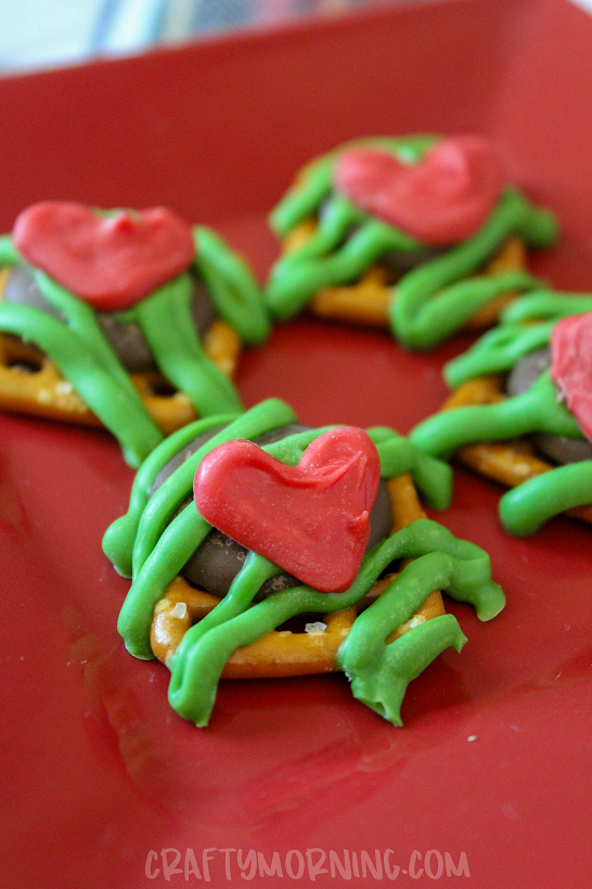 - Before the green has been able to set, stick a heart sprinkle or one of the heart candy melts on, lightly pressing into the green candy melts. Allow to set.