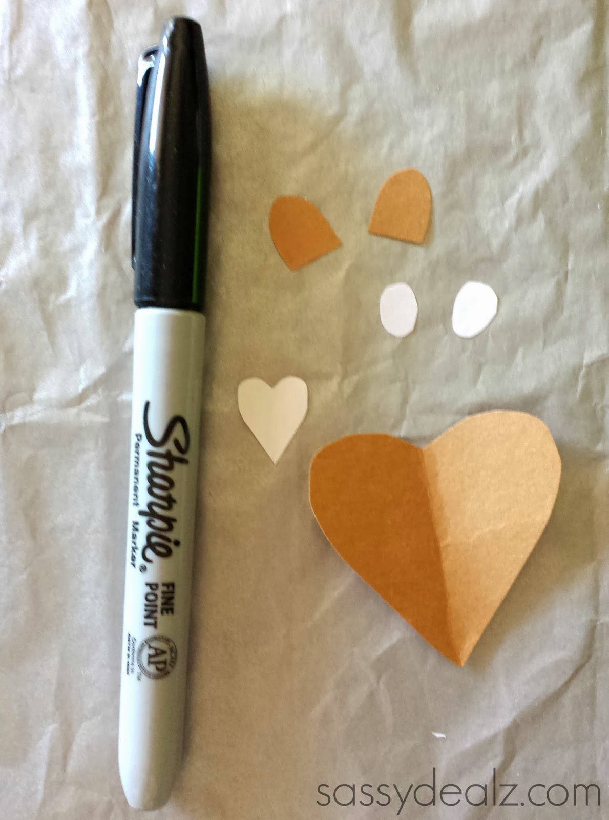 Start by cutting a big heart out of brown paper for the face, as well as two ears. Then cut a tiny white heart for the groundhog’s teeth and two oval eyes.
