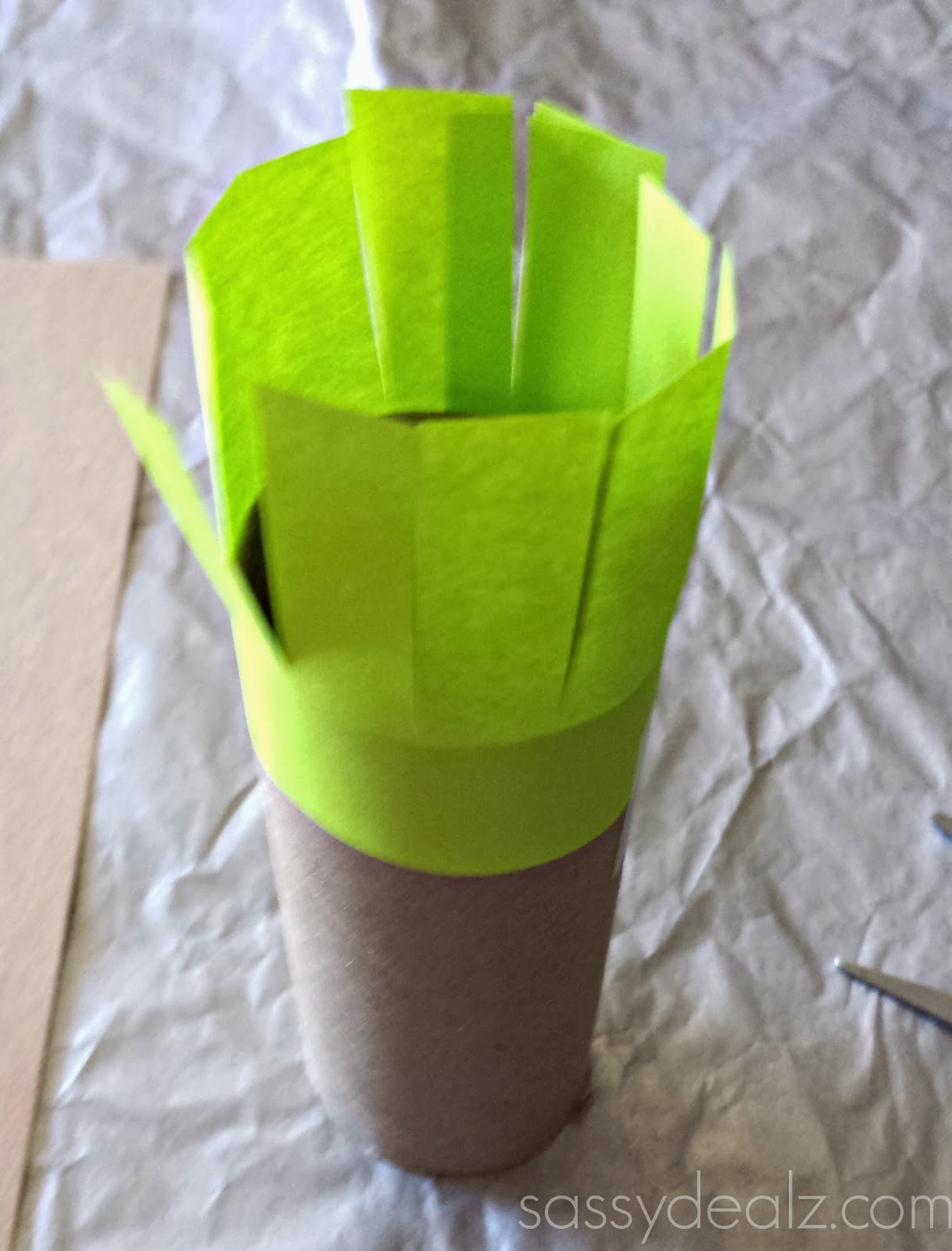 Glue the green strip of paper around the top of the TP tube about an inch down. Have the kids use a scissors and cut slits all around the paper to make green grass.