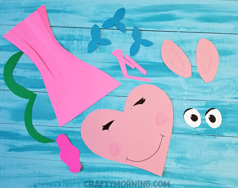 Start by cutting out a pink heart for Poppy’s face. Then cut some hair, a nose, eyes, ears, and blue flowers. For the green headband, put the heart on top of a green piece of paper and trace the middle curves. Glue them all together then add a smile and eyelashes!