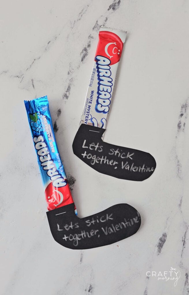 This is an easy Valentine idea for the hockey fans out there! Just grab some airhead candies, then draw the bottom of a hockey stick on black paper. Cut it out, staple it to the wrapper and write “Let’s stick together, Valentine!” These are perfect for hockey teams or in the classroom.