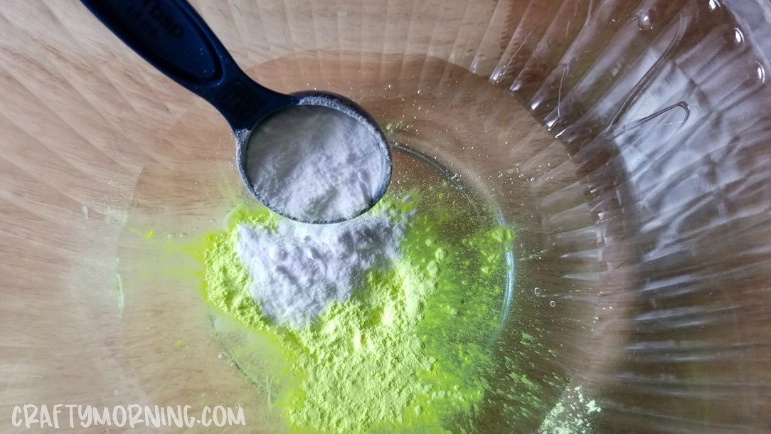 Steps 3-5: Add your glow in the dark paint or gel, glow in the dark powder and baking soda.