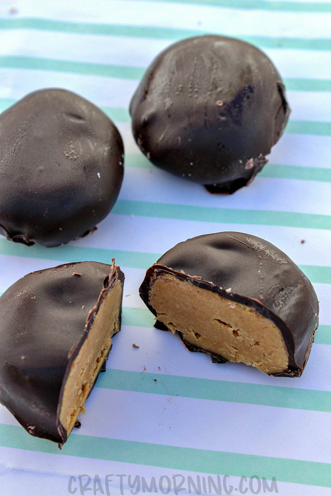 - Coat the peanut butter in chocolate melts and place on the parchment paper to put back into the freezer until they fully set. Â