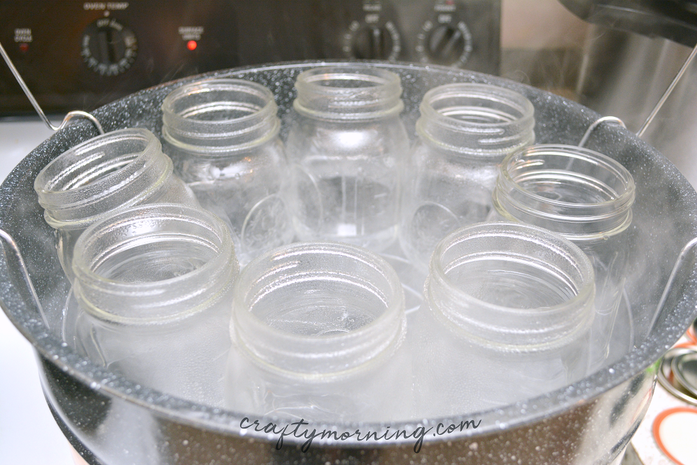 - On another burner, place the lids and rings for the jars in a pot of water over low heat. This will keep them hot and sterilized until you are ready to use them.