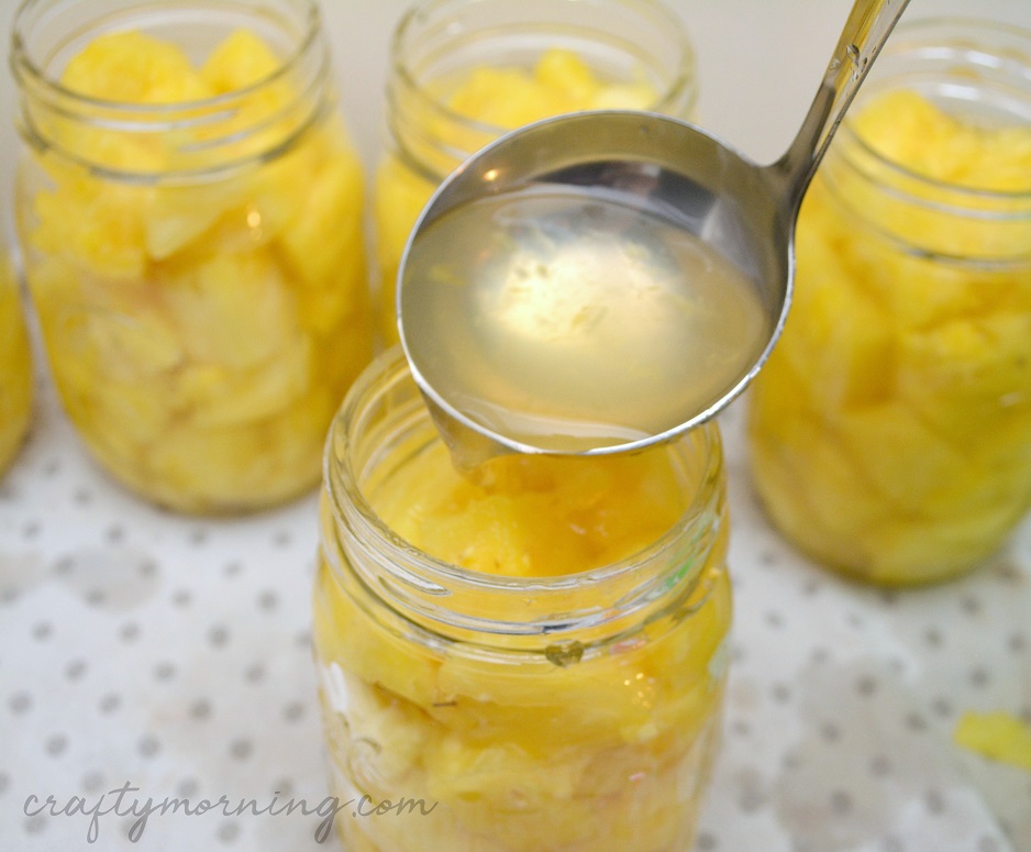 - As soon as the mixture begins to boil, reduce the heat to medium-low, as you do not want the mixture to reduce down. This will form an extra light syrup to can your pineapple in. If you wish, you can add just water if you want to can your pineapple without extra sweetener.