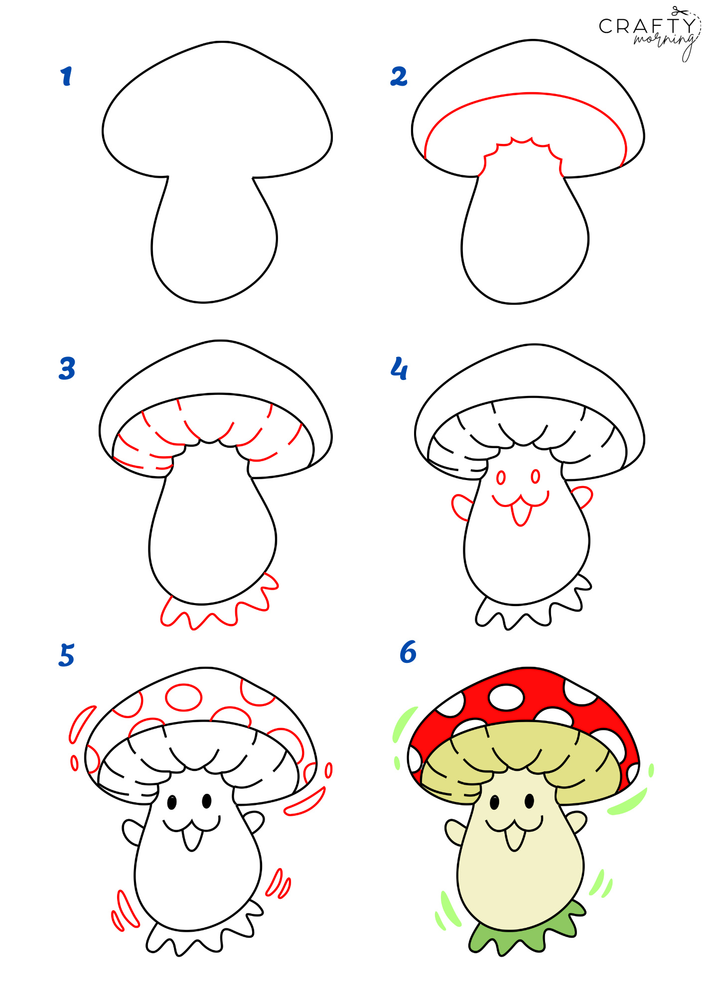 Draw a smiling dancing mushroom or stop at step 3 to make a normal mushroom. He is so cute he looks like he’s from Mario.