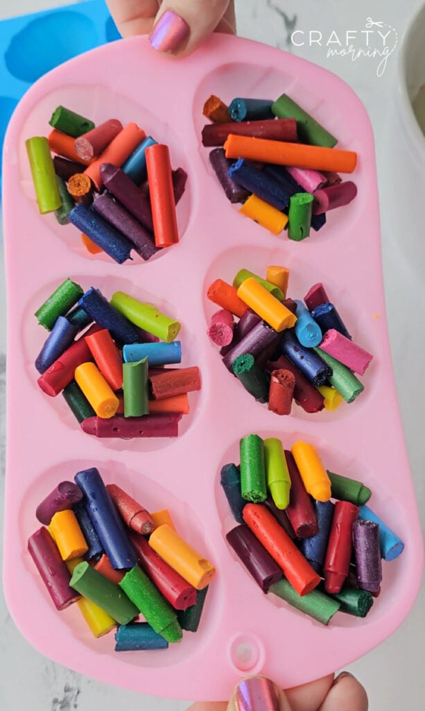 - Dry crayons completely then break into 3-4 pieces each and put in the silicone mold.