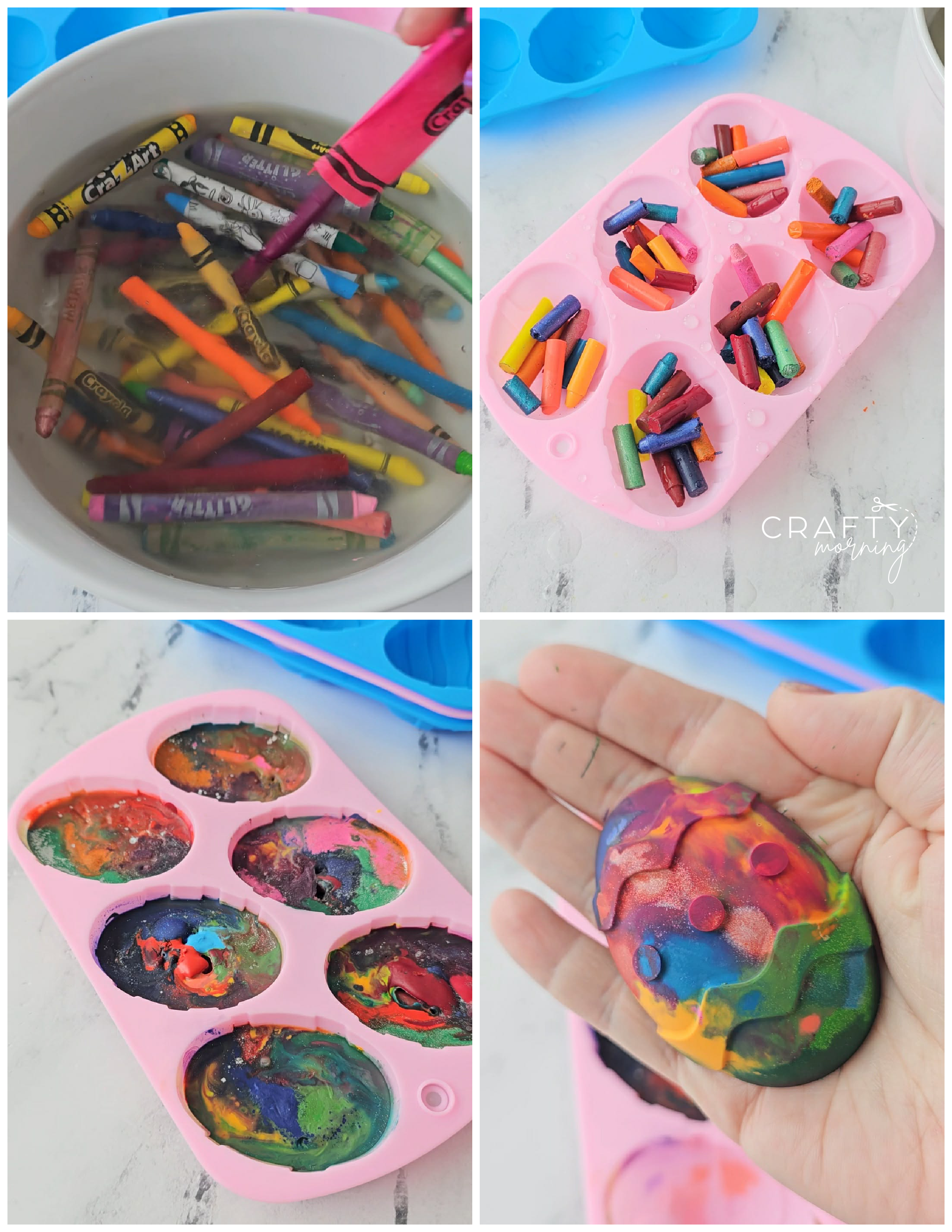 - Start by putting crayons in a bowl of warm/hot water and stirring with your hands. Take off all wrappers.