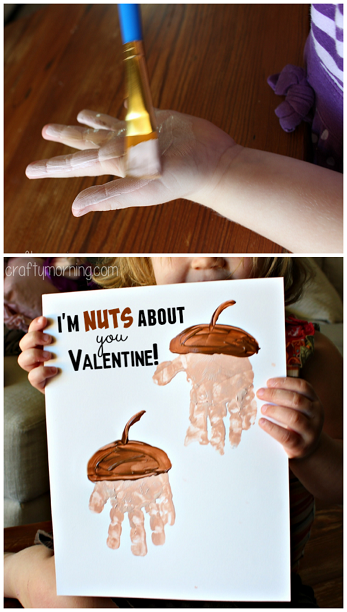 We did this handprint acorn craft a couple months ago but it also works for Valentine’s Day! Have your kids paint their hands and stamp it on a piece of white cardstock. Use a paintbrush and paint the acorn’s top above it. Finish off the valentine card with writing “I’m nuts about you Valentine!” See the original tutorial here.