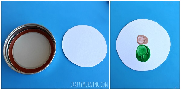 Start by taking out the mason jar’s inside lid and tracing it on a piece of white card stock paper. Dip your child’s thumb in green paint and stamp it on the paper. Mix up some skin colored paint and have them use their pointer finger for the head. Glue the white circle inside the mason jar lid.