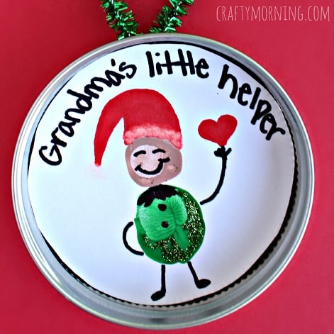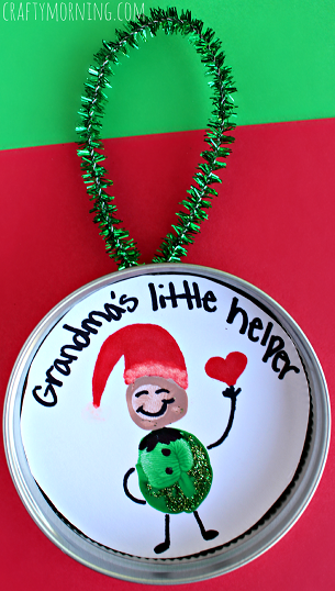 Last year we made some cute fingerprint elves so I thought it would be a great idea to put them on a Christmas ornament! We used a mason jar lid to make it into a homemade gift. Instead of “Santas little helper” you can say “Grandma’s little helper” too cute!