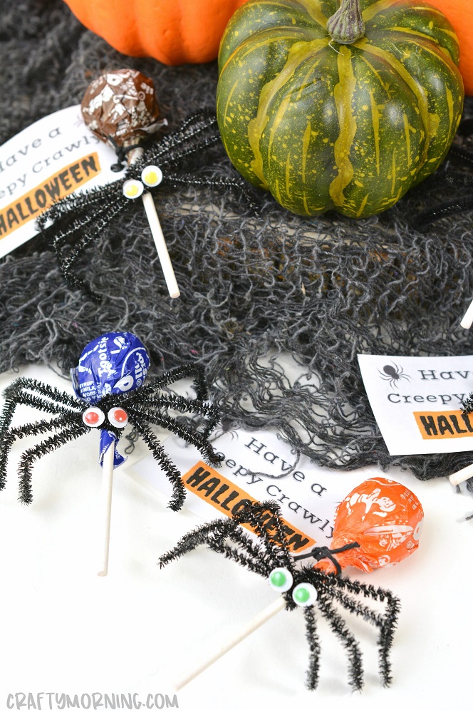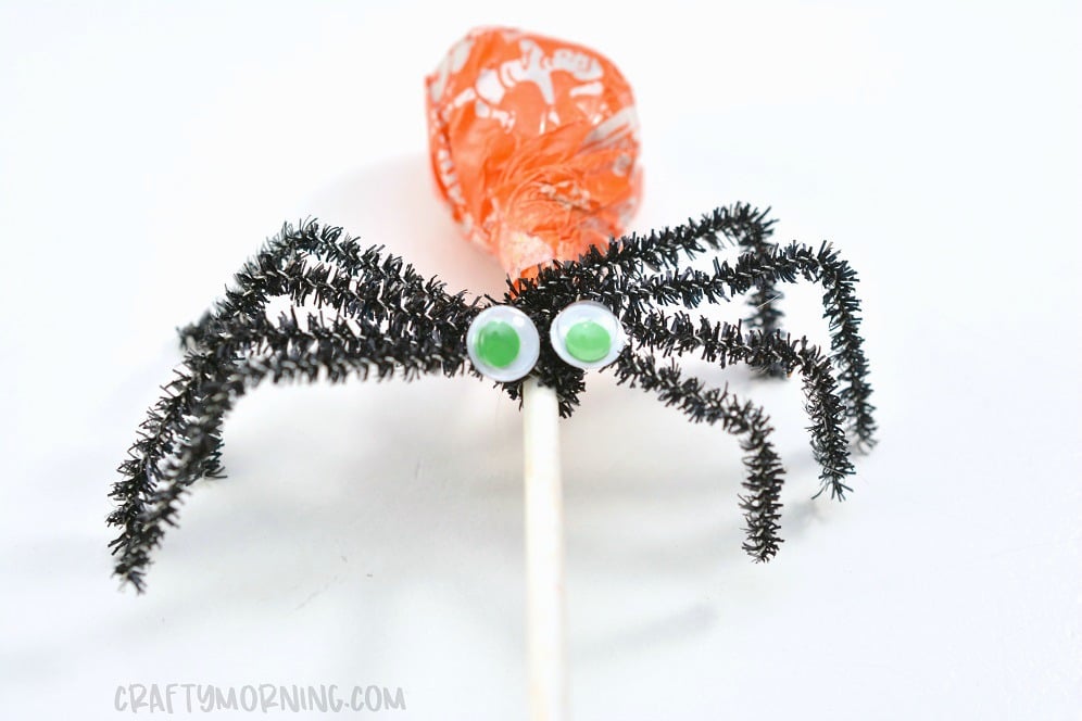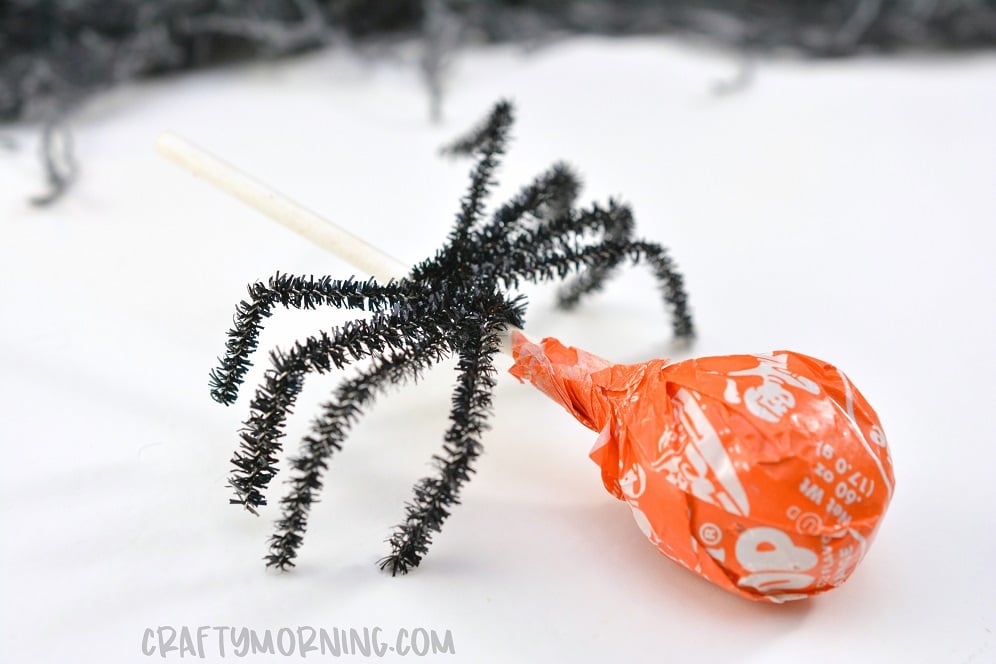 Make some fun lollipop spider treats to hand out on Halloween! They are so cute and easy to make the kids could help do them.